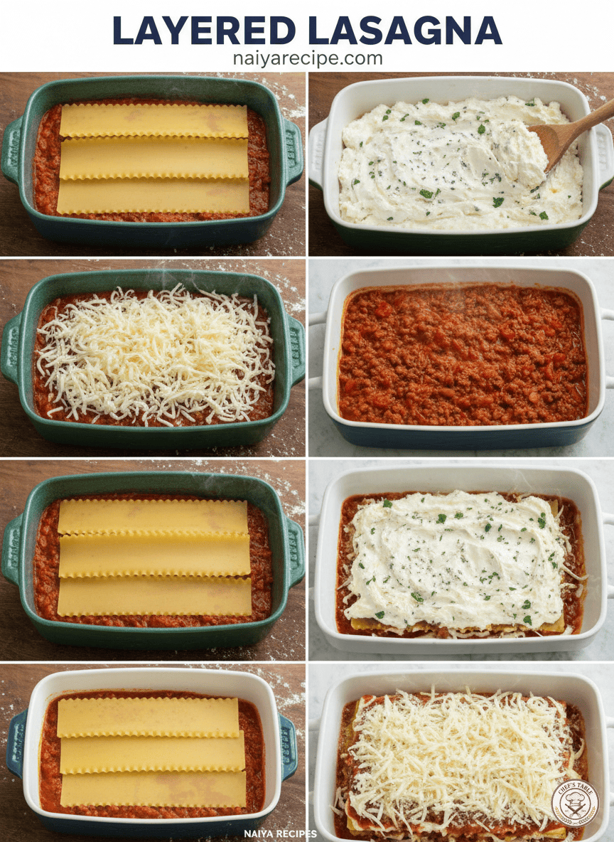 - Sauce Base (Image 1): Start by spreading about 1 to 1.5 cups of meat sauce evenly over the bottom of your 9×13 inch baking dish. This prevents the noodles from sticking and provides a flavorful base.